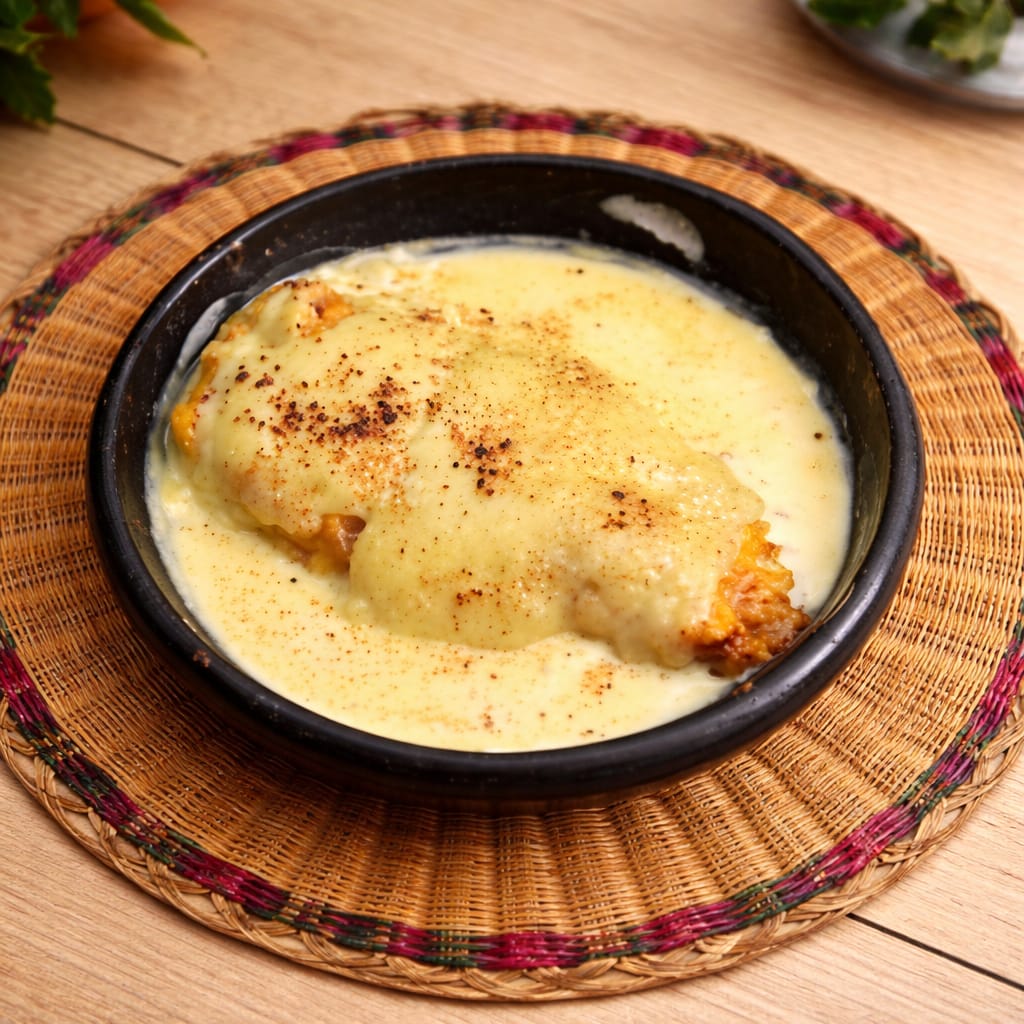 Todo el conjunto se baña delicadamente en crema de leche, aportando una suavidad extra que equilibra perfectamente el dulzor del maduro y el sabor del queso. Ideal como entrada, acompañamiento o antojo para compartir, este plato conquista por su sencillez, calidez y sabor casero.