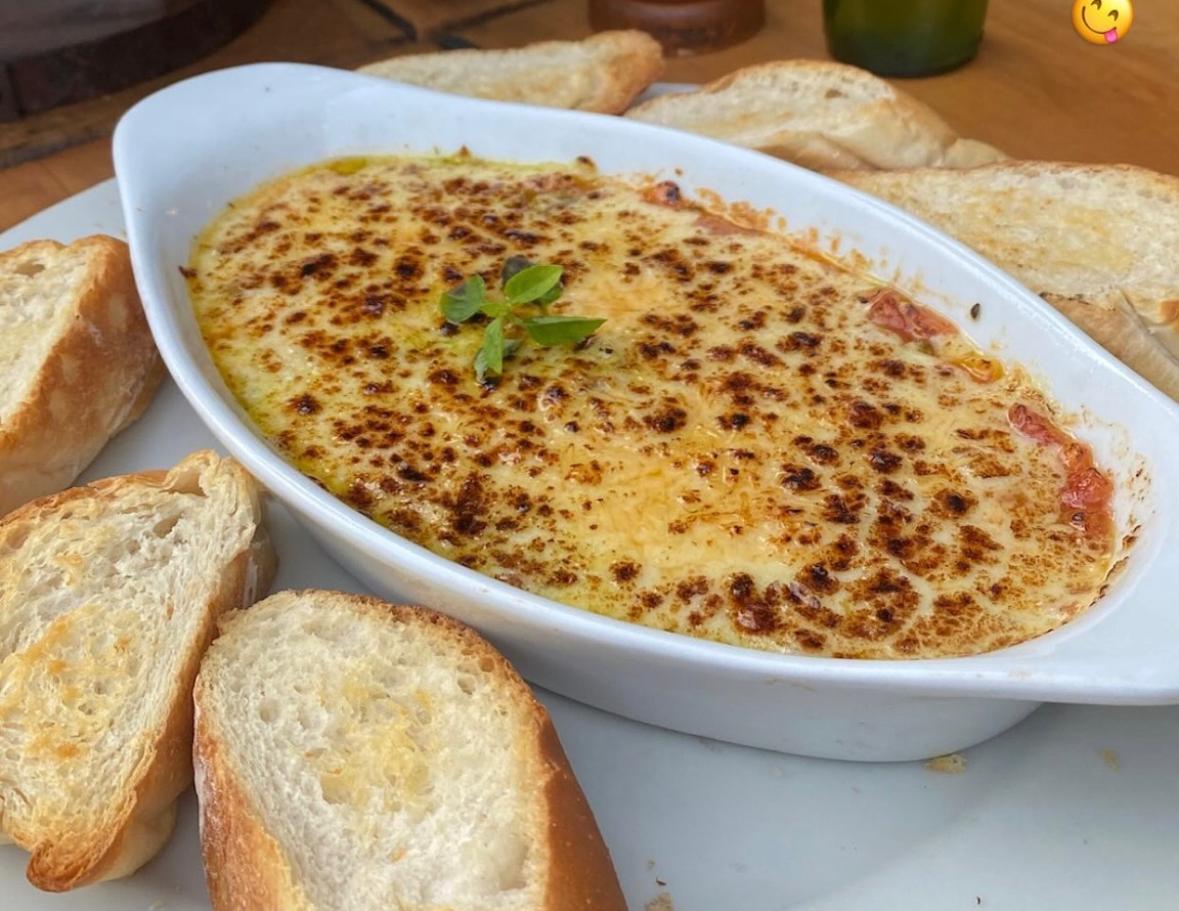 Todo se funde lentamente bajo una generosa capa de queso mozzarella, logrando una textura cremosa y envolvente que invita a mojar cada trozo de pan artesanal de la casa, recién horneado. Este plato es ideal como entrada o centro de mesa, sugerido para 4 personas, perfecto para abrir el apetito y compartir momentos alrededor de la mesa.