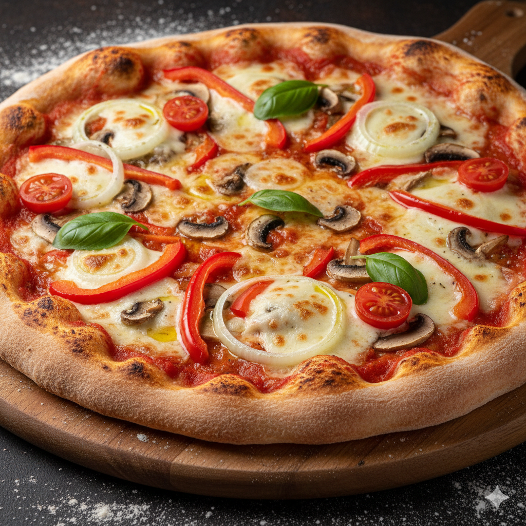 La Pizza Vegetariana es una opción fresca y equilibrada, perfecta para quienes disfrutan los sabores naturales. Pimentón crujiente, cebolla suave, tomate fresco y champiñones jugosos se combinan sobre una base de salsa artesanal y abundante queso fundido.